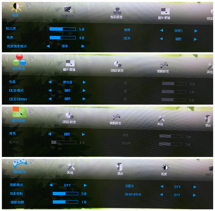 入手一台螢幕,最重要的第一件事就是要做基本顯示調整!我個人操作方式是先將螢幕重設為預設值,然後使用顯卡軟體調整亮度與對比,使得可以分辨清楚上圖中上半部的白色與黑色,接著是色彩飽和度與色階看看有沒有問題,順便檢查有沒有亮暗點,最後調整螢幕的亮度對比到眼睛看起來舒服即可,由於我的環境比較暗所以我亮度也調比較暗。我的設定值是軟體亮度23對比85、色調0飽和度105;螢幕對比50亮度40,給大家參考囉。調整完成之後,就趕快來體驗吧XD