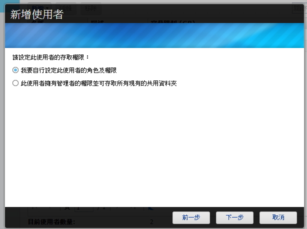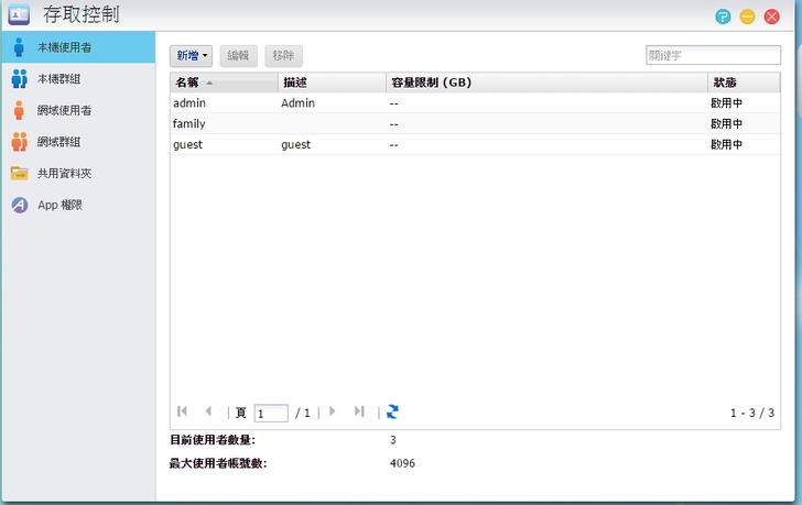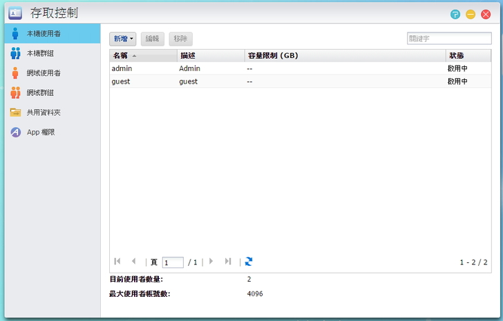 ▲預設的使用者有管理者與訪客,這時我們要新增新的使用者,當然,若使用者多時,可以整理成群組。