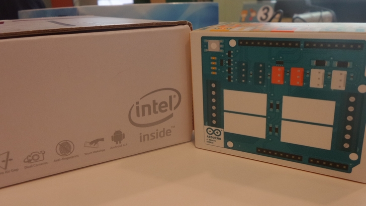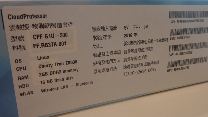 【▼】雲教授物聯網智造套件(CPF) 核心OS是基於Linux,除了Intel CPU之外,RAM為2GB的DDR3,並內建16GB的 Flash Disk,網路部分有Wi-Fi與藍芽模組,電源則吃5V@3A。