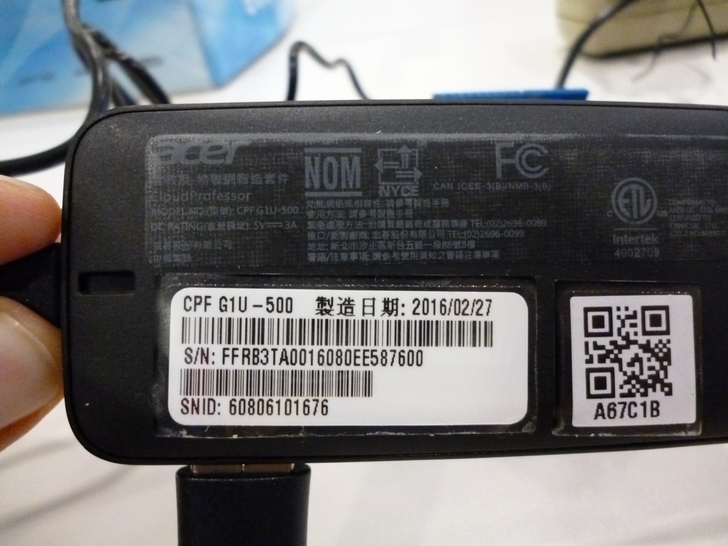 【▼】雲教授其型號為(CPF G1U-500)背面有雲教授的產品序號、SNID,都是記錄保固資訊的號碼。並通過美國FCC、墨西哥NOM、NYCE與北美Intertek ETL 認證,而右下角的QR Code能幫助App與雲教授作連結。