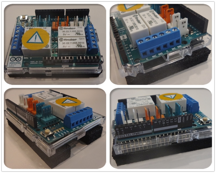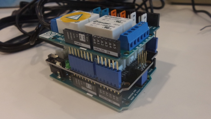 【▼】完成的硬體連線,最底層為Arduino Leonardo、其次為Arduino Shield,最上層是四繼電器擴充版。