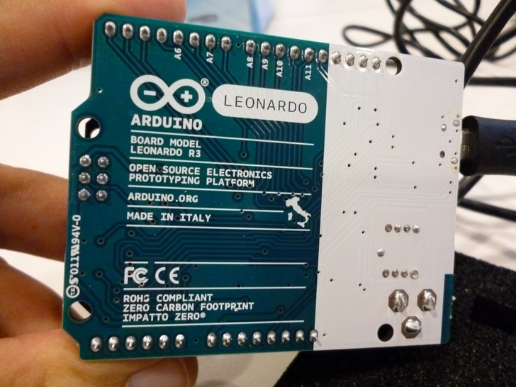 【▼】Arduino Leonardo開發板的背面,後面寫著 "李奧納多",這是版本的差異,Arduino前一版為Uno版,Leonardo版比較新,硬體規格也比較強,近期Maker大都採用Leonardo的版本居多。