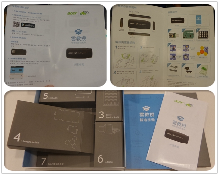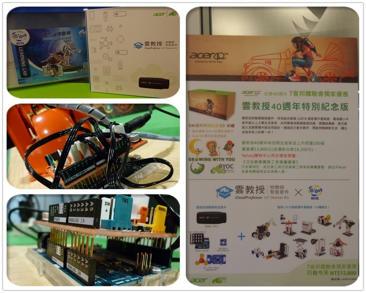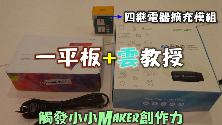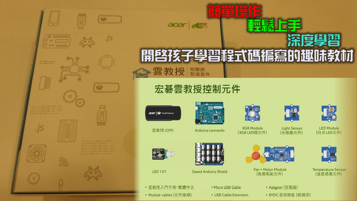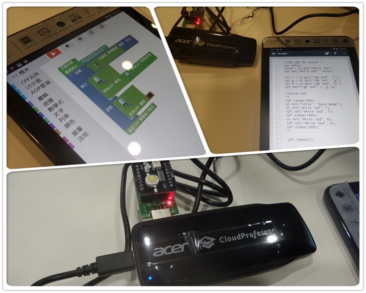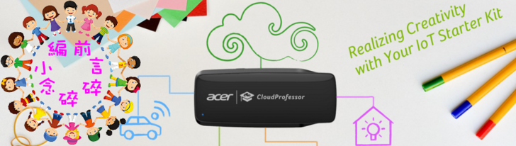 小編是六年級生,在我小的時候,第一次接觸電腦是「玩」20286的小精靈,那時螢幕還是全綠色的,指令都是下command的方式,小編為什麼說是「玩」,因為「玩」才讓小編玩出興趣,自學出如何下command才能玩到遊戲,所以「玩」不一定是壞事,能間接培養出興趣,進而變成專長也是大有人在。每一個父母都希望自己的孩子比自己強,小編父母亦是如此,小編上了高中才有屬於自己的電腦,是老爸去光華商場買的套裝電腦,即使老爸現在對於電腦還不是很在行,但老爸當年就知道電腦是未來趨勢,讓我先接觸真的是非常有眼光,至少到現在小編對於3C領域還頗有心得。不過現在科技真的進步神速,早期高中才上的計算機程式,現在國中就在上了,而且上的還不是簡單的BASIC直譯式語言,而是連小編都沒學過的Scratch,若不趕快學習,有天小朋友問您答不出,那就尷尬了。今日要帶大家認識的是Acer雲教授,這是什麼?是人?是雲?還是某種語言?其實都不對,雲教授是款物聯網智造套件,其中雲教授本體(CloudProfessor;CPF),可說是「雲教授物聯網智造套件」的核心,而雲教授可以透過App去控制附屬套件的終端應用,是不折不扣的物聯網概念。硬體隨插即用與創客編譯的直覺式程式語言,如JavaScript和LiveCode,讓小朋友「作中玩,玩中學」,這是比傳統積木更好玩、比外語更有用,全世界都在學,這是屬於全世界的溝通語言。話不多說,馬上帶大家回顧Acer雲端園遊會的精彩內容。文章內容分為以下章節,都可以依需求自行點閱來觀賞。