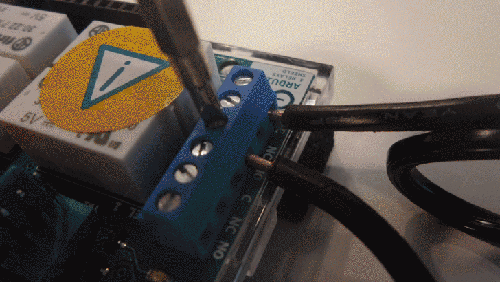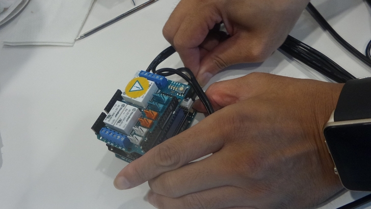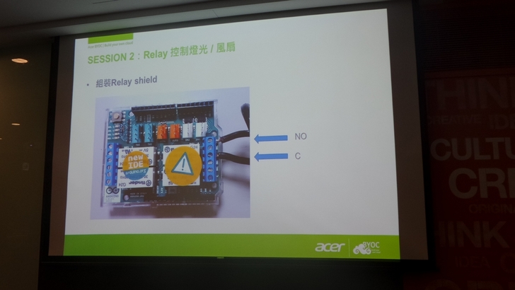 【▼】知道Relay的原理後,馬上就來控制燈光與風扇,首先先將Shield接上Relay擴充版的 NO 與 C端點上。
