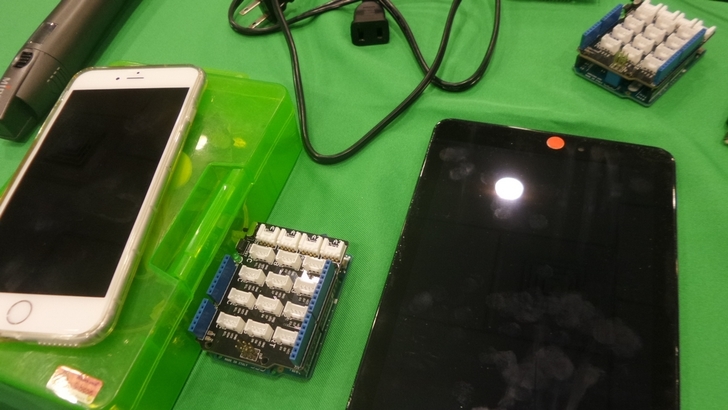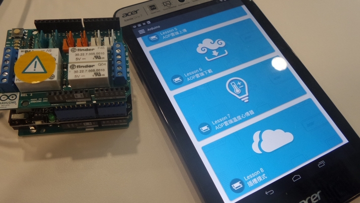 【▼】每組桌上都有一平板+雲教授套件與一組四繼電器擴充模組,讓大家發揮Maker的創作力。