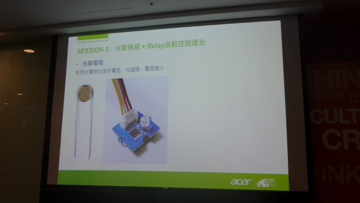 【▼】繼續第三個實作,是光敏模組+Relay自動控制燈光,達人也稍微說明了光敏電阻的利用光電島效應,光越強,電阻就越小。