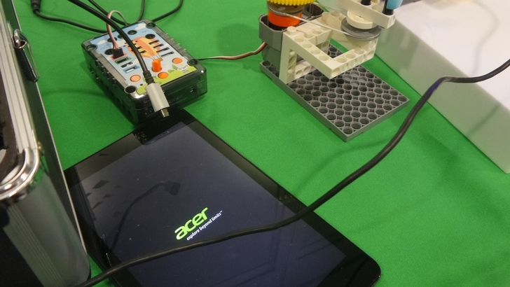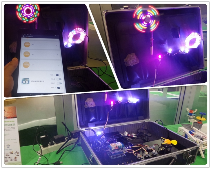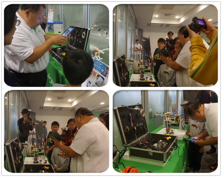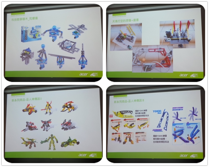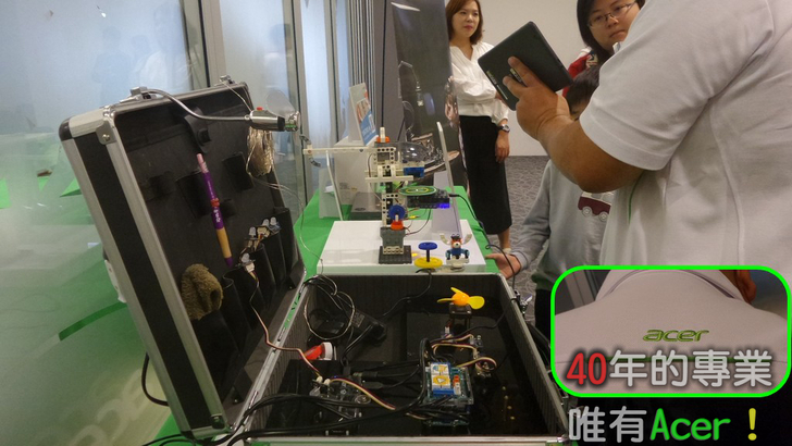 【▼】活動現場後方也有相關產品的展示,這只有在夜市擺攤才看的到的百寶箱,現在原封不動的在此展出,真讓人期待。Acer活動人員將雲教授套件已經組裝好,有小朋友最愛的積木直升機、也有光芒四射的燈光秀,讓眾人大開眼界。