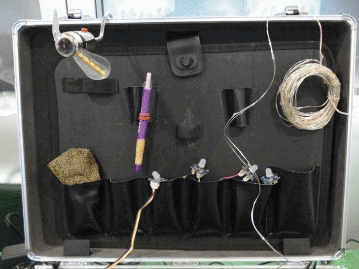 【▼】百寶箱內的雲教授套件,除了雲教授本體外,還有LED發光模組、迷你風扇、繼電器控制模組等。