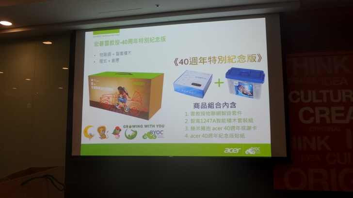 【▼】針對Acer 40週年,推出的雲教授40週年特別紀念版,裡面多了「40種智高1247A積木套裝組」,課程由淺入深,適合完全沒有程式碼概念的6歲以上兒童從頭開始,讓小朋友從組裝到遙控,學習到程式+創意!