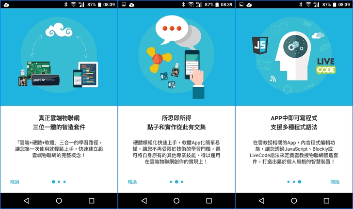 【▼】雲教授App登入後會有導引精靈,說明雲教授是三位一體(雲端+硬體+軟體)的智造套件,支援的語言包含了有JavaScript、Blockly與 LiveCode,打造IoT+IoB不是夢。