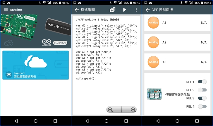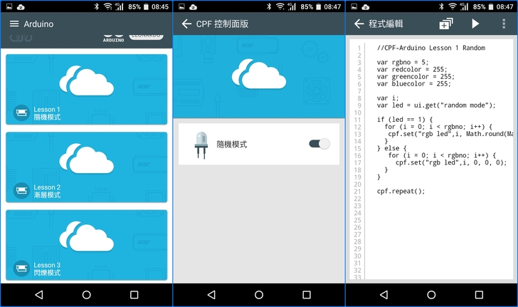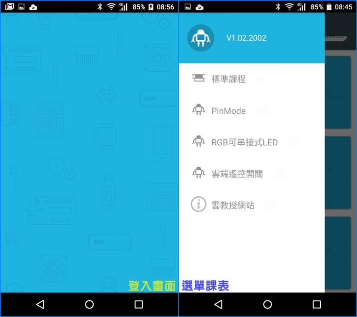 【▼】接著以同一台平板開啟CPF Arduino,實作的版本是V1.02.2002,登入後有選單課表,分為標準課程、PinMode、RGB可串接式LED、雲端遙控開關與連上雲教授網站五大功能。