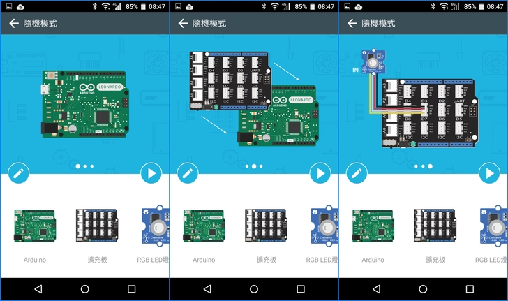 【▼】在RGB可串接式LED課程中,有提供隨機、漸層與閃爍的燈光模式,可讓小朋友學習不同程式的語法,以隨機模式來說,就可以學得 "random()"的指令用法。
