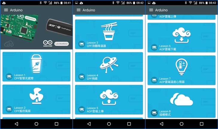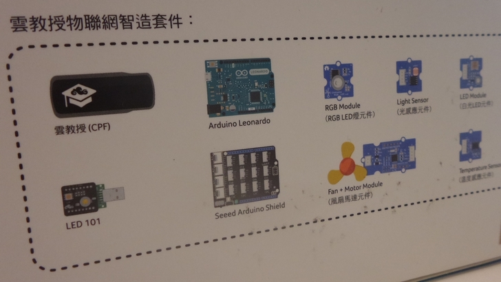 【▼】以標準課程來看,有智慧光感燈、遙控風扇、泡麵降溫器、CPF飛碟、AOP雲端上下傳、AOP雲端溫度心情器與插槽模式等 。