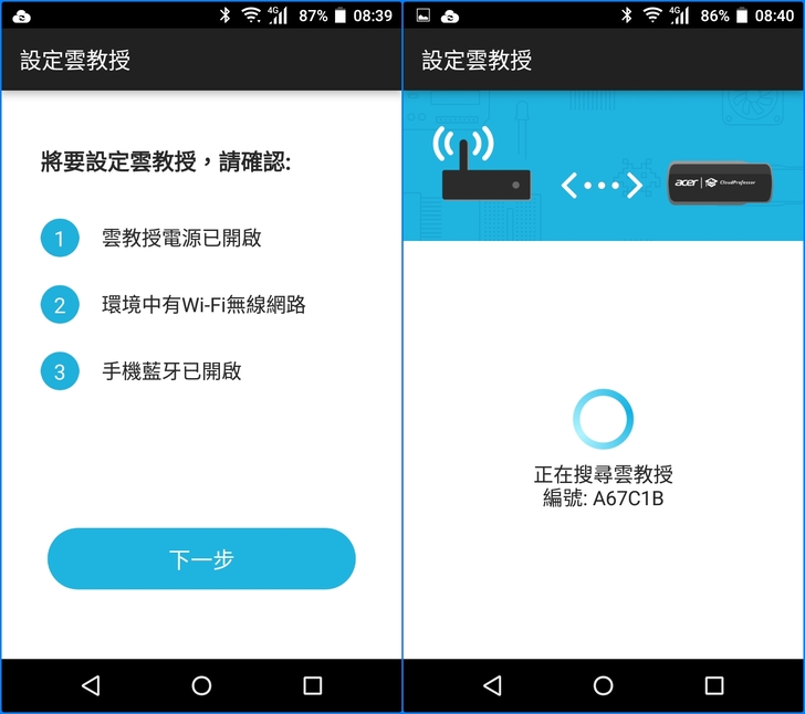 【▼】一開始得先設定好雲教授,必須先開啟電源,並確認無線網路與藍芽有開啟,最後可Scan雲教授背面的QR Code,就會自動偵測並連線。