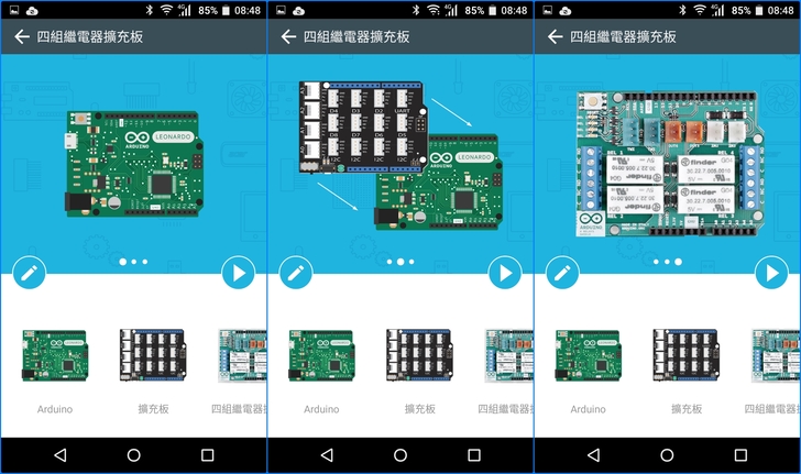 【▼】四組繼電器擴充板,下方可有排針,可以安插於 Arduino Leonardo開發板上,作數位PWM控制。