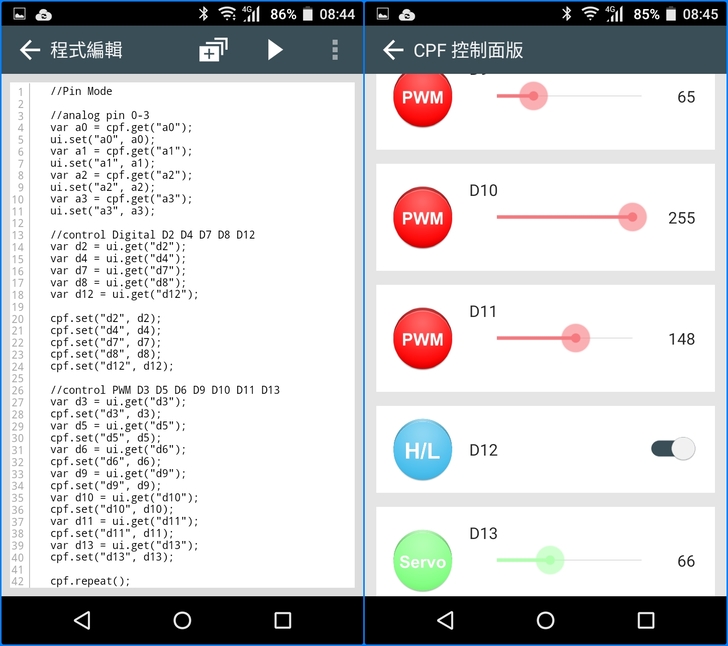 【▼】實作必備的兩個App,一個是雲教授,另一個為CPF Arduino,在Android與iOS平台上都有提供。