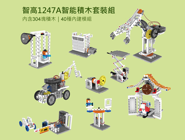 【▼】雖然沒有看到智高1247A智能積木套裝組,也來看看有哪些物品吧!有304塊積木,並內建40種模組,機械手臂、升降梯、平交道讓你玩得不亦樂乎。