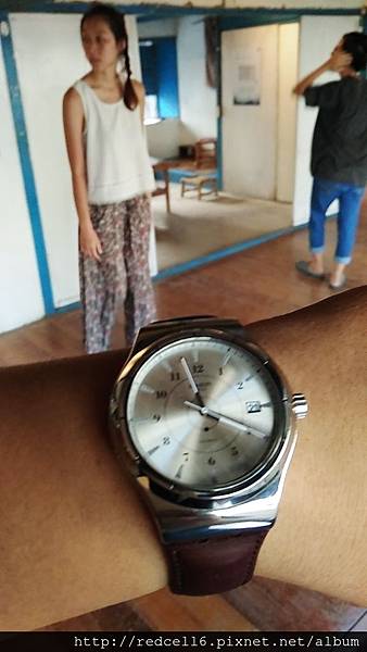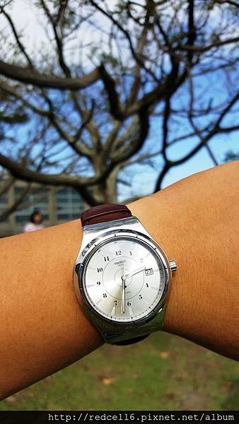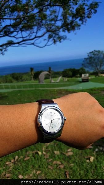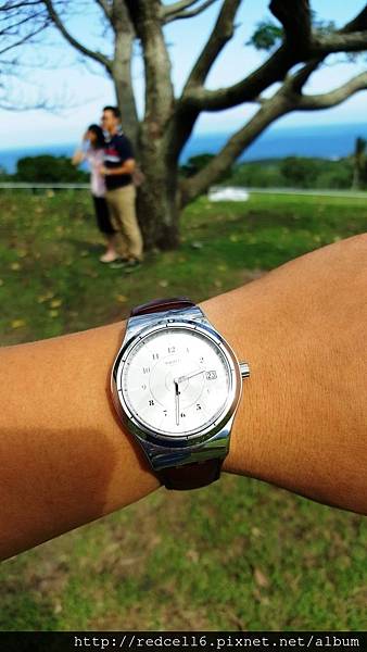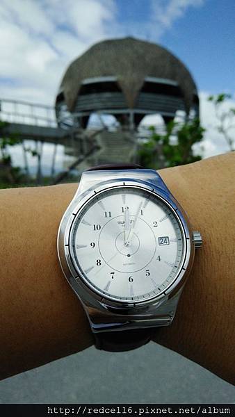 【▼】戴著Swatch SISTEM51 Irony EARTH大地呼喚 (YIS400)機械錶踏青旅遊好樂趣。