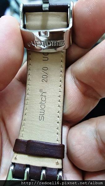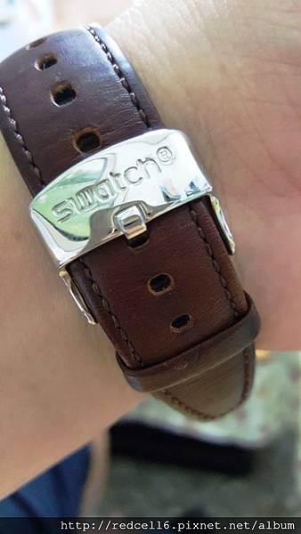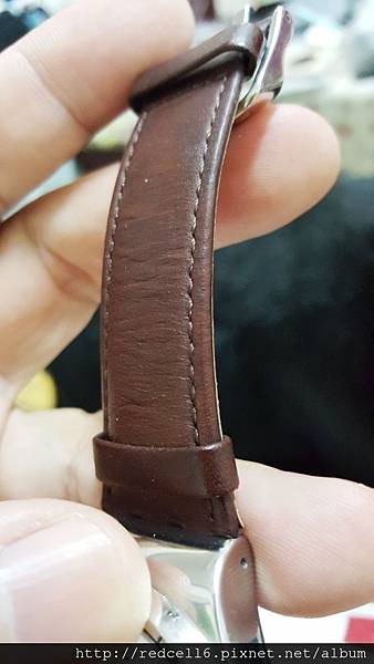 【▼】手工縫線皮革錶帶及金屬錶扣。
