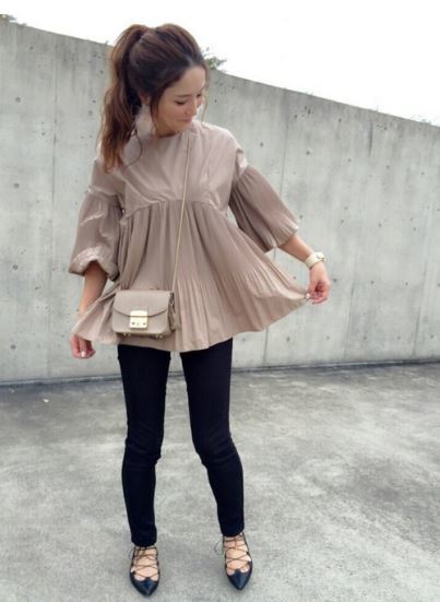 雖然是男生常在穿的黑褲,但也可以打造出女人味。女人味十足的傘狀下擺襯衫,讓甜、辛搭配超Lady!