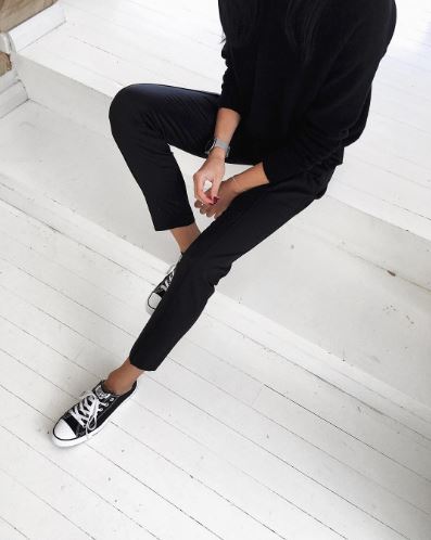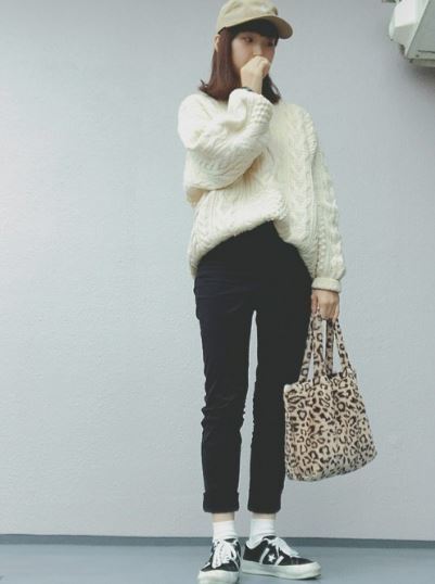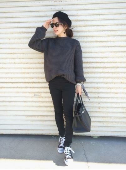 搭配黑褲的針織毛衣,毛衣的顏色取決於休閒,或是成熟的風格。而腳上黑色的帆布鞋意外地和黑褲合適呢!