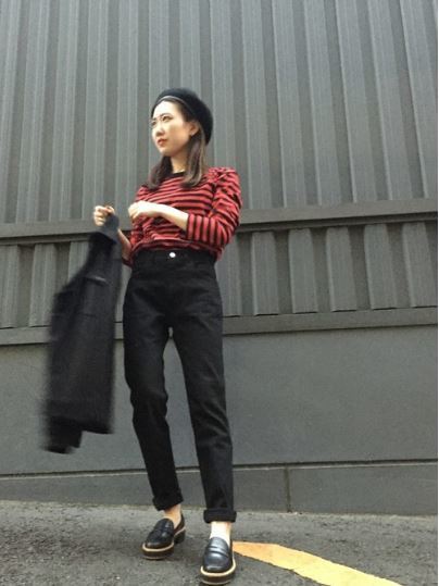 黑褲x黑紅條紋上衣 也相當好看、顯眼!有種原宿酷酷的感覺!若是黑色的掏腰褲,並微微露出腳踝,比例會看起來更好喔!