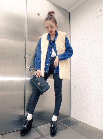 毛毛背心配上牛仔外套又把時尚度拉高一個階級!進階版的穿搭配上松糕鞋讓腿看起來更長、整體更時尚!