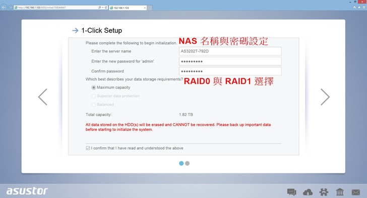 ▼接下來則是NAS 的名稱、登入密碼還有RAID的設定,AS3202T提供了講究資料安全的RAID1與追求速度的RAID0兩種的方案,就看使用者自行應用了,設定完成後硬碟上原有的資料都會被清除,這點各位要稍微注意!!!