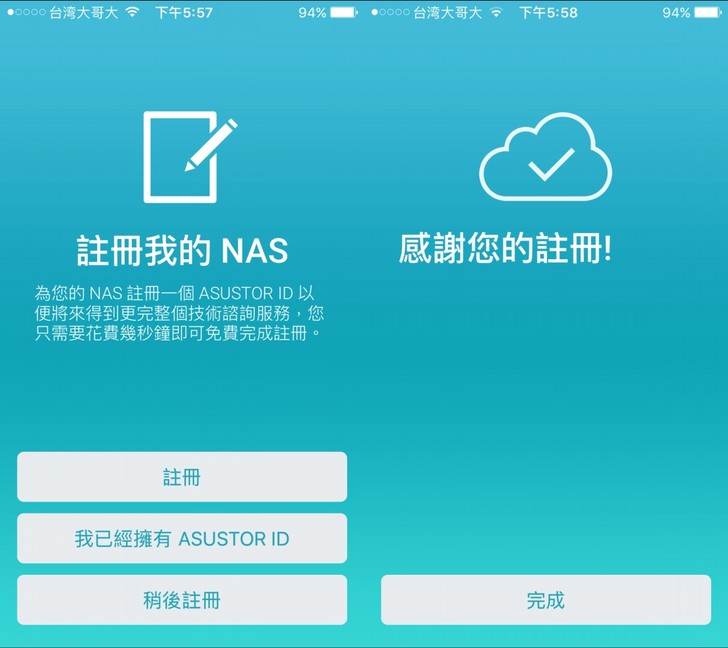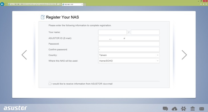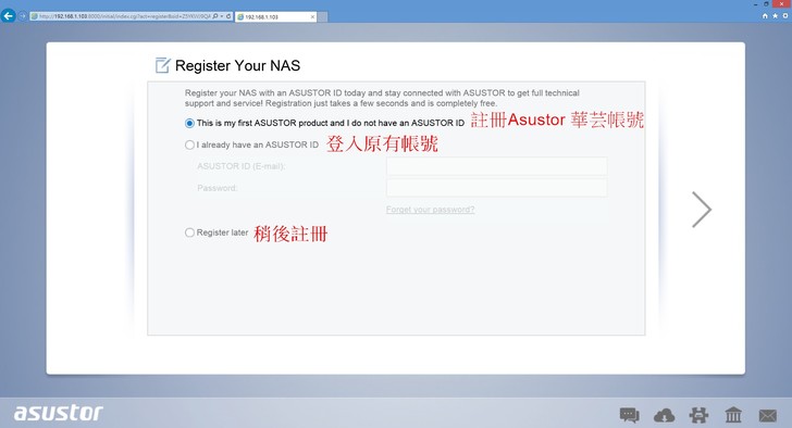 ▼到了這邊只需要登入或註冊Asustor ID就完成囉! Asustor可以用在許多服務上,註冊也超簡單的;基本資料、填寫完畢後,點選Start就能開始體驗到NAS的強大功能啦!