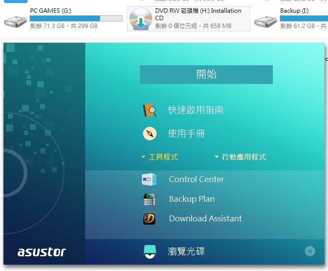▼使用盒裝附的光碟來安裝ASUSTOR Control Center,也可以透過網路從官網下載。
