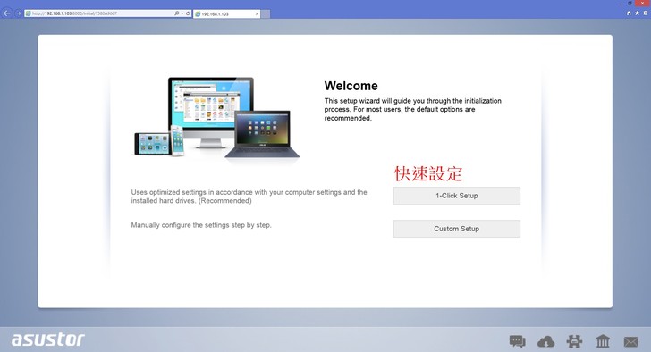 ▼接就是NAS的設定啦! 有而外需求的可以點選Custom Setup自訂設定,可以選擇的設定會比多;而新手使用者或是沒其他需求的,跟我一樣使用最上面的 1-Click Setup就好囉!