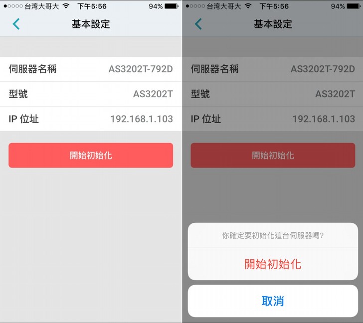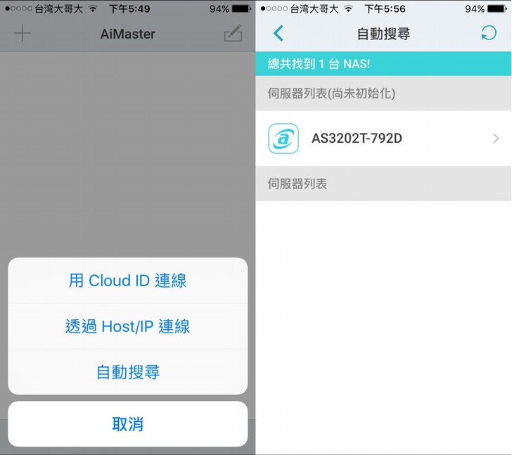 ▼本次使用Ios 系統示範,開啟AiMaster後會詢問使用者要用哪種方式來尋找NAS,這邊我們使用自動搜尋來掃描區域網路內中NAS裝置,抓到之就可以看到有一台尚未初始化的NAS。