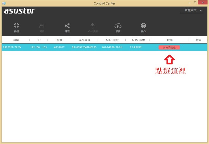 ▼開啟ASUSTOR Control Center後,就會自動搜尋區域網路內的Asustor NAS;點選箭頭處的「尚未初始化」就會開始進行NAS的設定。