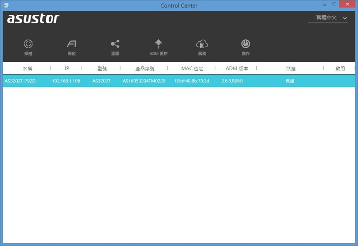 ▼ASUSTOR Control Center主畫面,ASUSTOR Control Center 提供了幾個蠻方便的設定,像是:網路磁碟機設定、ADM更新、WOL 網路喚醒等功能設定。