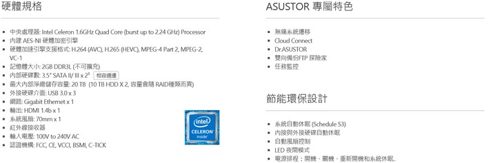 1. 高效能低耗電的硬體規格:AS3202T在CPU的選擇上使用了Intel x86架構的四核心處理器Intel Celeron J3160 時脈最高可達2.24 GHz;因為使用了嵌入式平台的Braswell產品,所以非常的省電,但又不失效能。