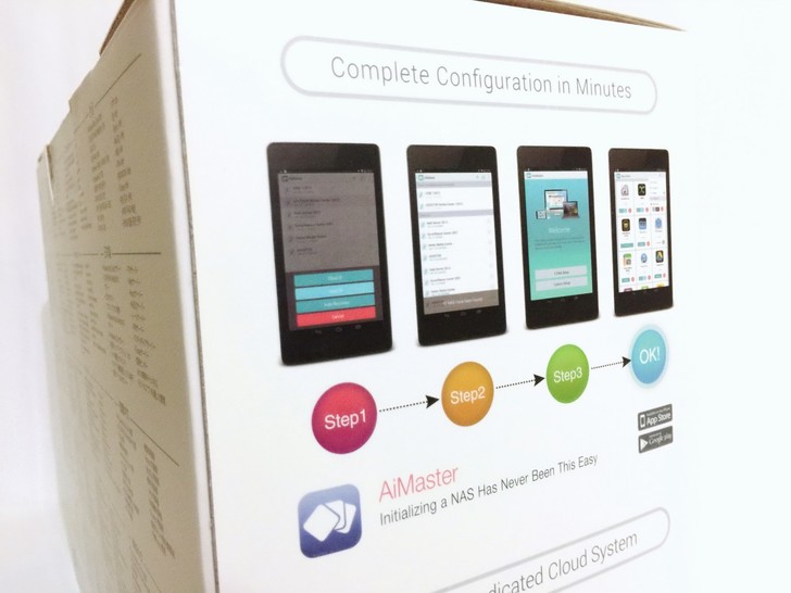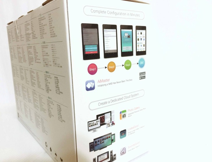 ▼左側包裝介紹了是自家推出的AiMaster,考慮到現在人使用手機或行動裝置的時間遠比電腦多出許多,甚至是沒有電腦的用戶所推出的服務;透過手指在螢幕上比畫幾下,即可輕鬆的設定完NAS,支援Android與iOS,設定起來可說是相當方便呢!