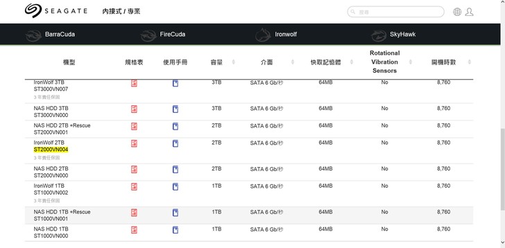 ▼Seagate NAS硬碟規格比較表,購買前可以針對自己的需求做挑選。