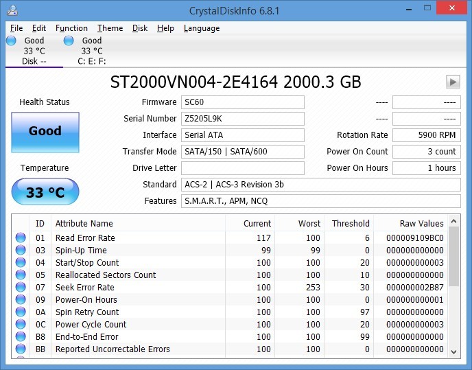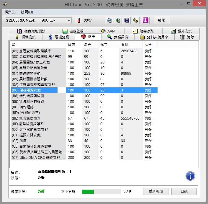▼HD Tune Pro 健康資訊,開啟動時硬碟溫度約在33度左右。