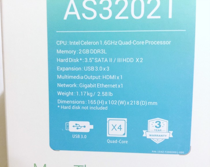 ▼硬體規格標示,型號為AS3202T,它還有個孿生兄弟AS3204T為四槽設計,AS3202T本機使用Intel Celeron 四核心CPU與2GB DDR3L 低電壓記憶體、1Gbps網路卡,整體的效能還不錯,拿來播放4K影片也不是問題,而且AS3202T使用的 Celeron J3160有Hyper-Transcoding技術,使用LooksGood轉檔整體效能可以提升不少。