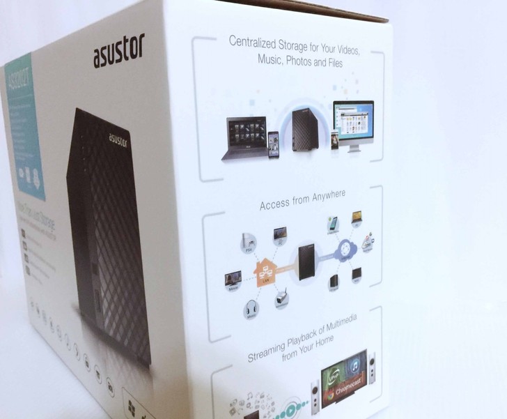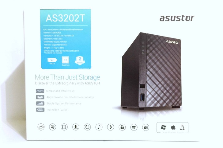▼本次的主角,由華芸科技Asustor所推出的AS3202T雙槽式NAS,這台AS3202T是定位在入門家庭與專業使用者之間,所以整體的設置上都給人好上手、易親近的感覺,就連外包裝也是呢~使用蠻多的圖示做說明。