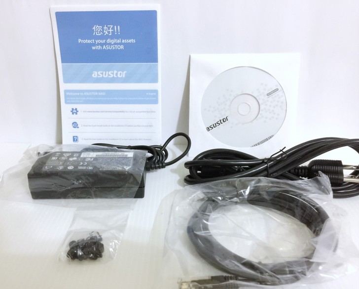 ▼內附配件一覽: 紙本說明書、NAS安裝光碟、變壓器、AC電源線、Cat.5e 網路線還有栓鎖硬碟的螺絲八顆。
