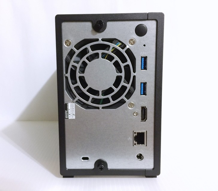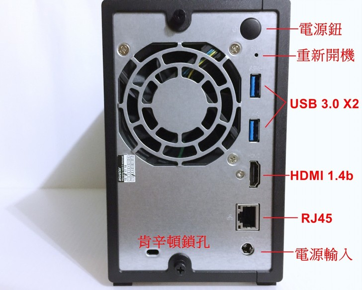 ▼機身背後I/O:開機鈕、插孔式重開機鈕、USB 3.0 X2、HDMI1.4b、RJ45網路、DC電源、肯辛頓鎖孔;還有一個公分大的風扇協助散熱。