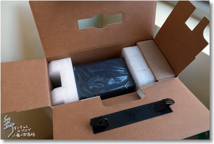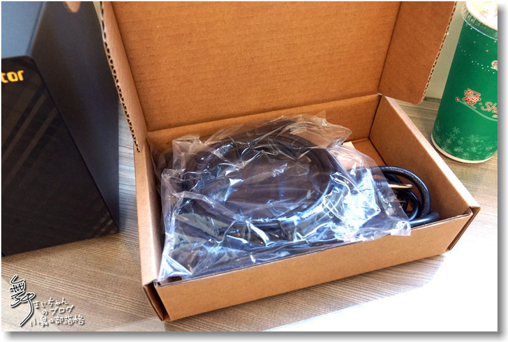 ▲把配件盒中的東西全部拿出來,盒裡有電源線、變壓器、網路線、手旋螺絲包、驅動光碟、快速說明書。