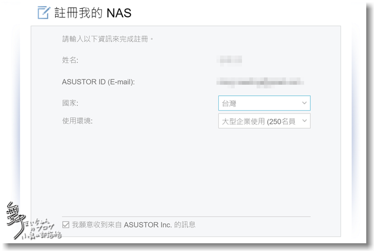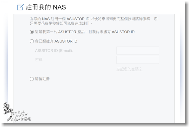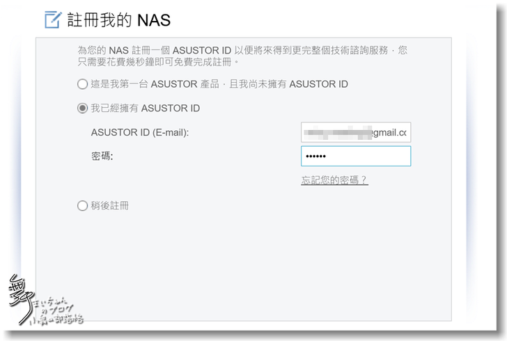 ▲因為我不是第一次使用ASUSTOR的NAS,所以就輸入原本的ID資料即可。