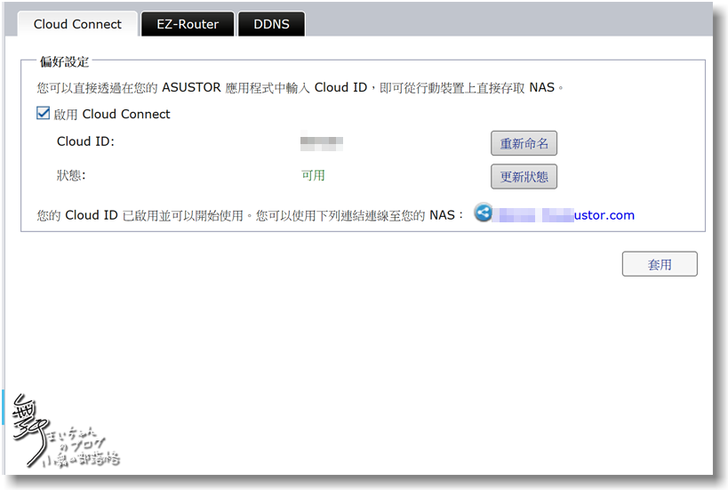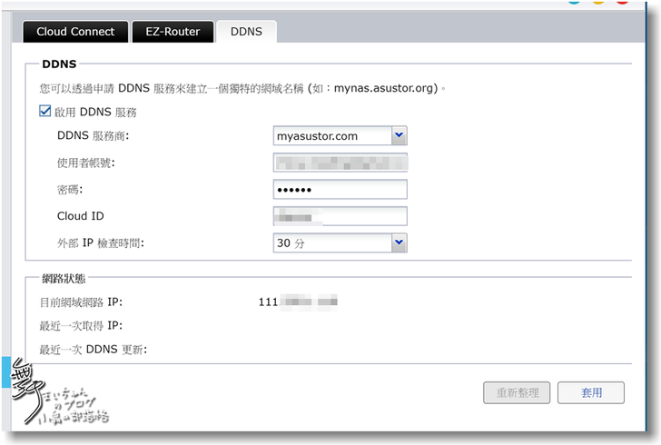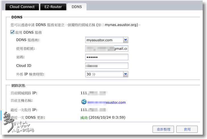 ▲輸入使用者、密碼、Cloud ID後按下《套用》,若看到成功的話就完成第一階段了,但我使用中華電信的光世代,所以需記得要再開啟防火墻連接埠就可以了。
