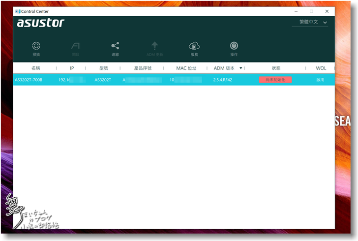 ▲更新後開啟ASUSTOR Control Center,從AS3202T的狀態中看到尚未初始化,沒關係,馬上就來進行。