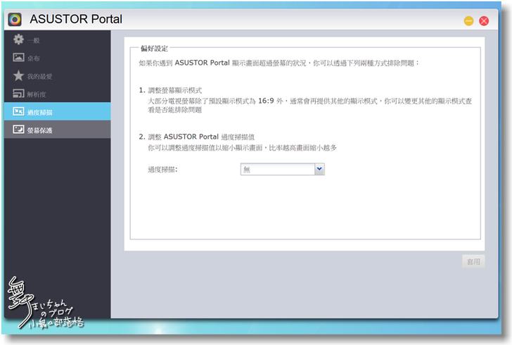 ▲另一種方式則是調整《ASUSTOR Portal》 的解析度設定,在[過度掃瞄]的選項中可以看到 none 與 1~3% 的選項,可以選擇縮小ASUSTOR Portal 畫面的比例。