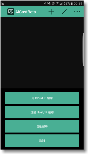 ▲安裝完《AiCast》後,開啟AiCast並點選右上角[ + ]來新增和NAS的連接,這裡可以透過三種方式連接NAS:Cloud ID、Host/IP和自動搜尋。