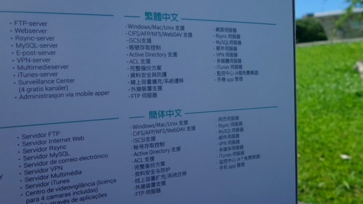 【▼】AS3202T包裝外箱背面為多國語言的介紹,包含各平台的支援、各種伺服器的架設應有盡有,不得不說台灣作NAS真的世界有名,前五大就有好幾個是台灣之光,所以推廣到世界是各廠商非常重要的課題,Asustor軟硬體不輸人,但行銷這部分Asustor真的要加把勁。
