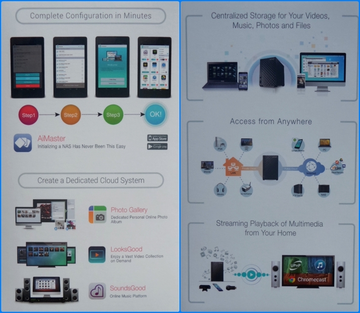 【▼】AS3202T包裝外箱的兩個側面資訊,以往安裝NAS都要透過電腦連接作設定,現在在App上就可以輕易安裝,Asustor所提供的AiMaster就是這樣一個服務;而內建有HDMI的AS3202T,除了可以連接電視、電腦使用Photo Gallery、LooksGood、SoundsGood作多媒體欣賞外,多媒體App更讓您走到哪都能無時無刻串流觀看多媒體檔案。